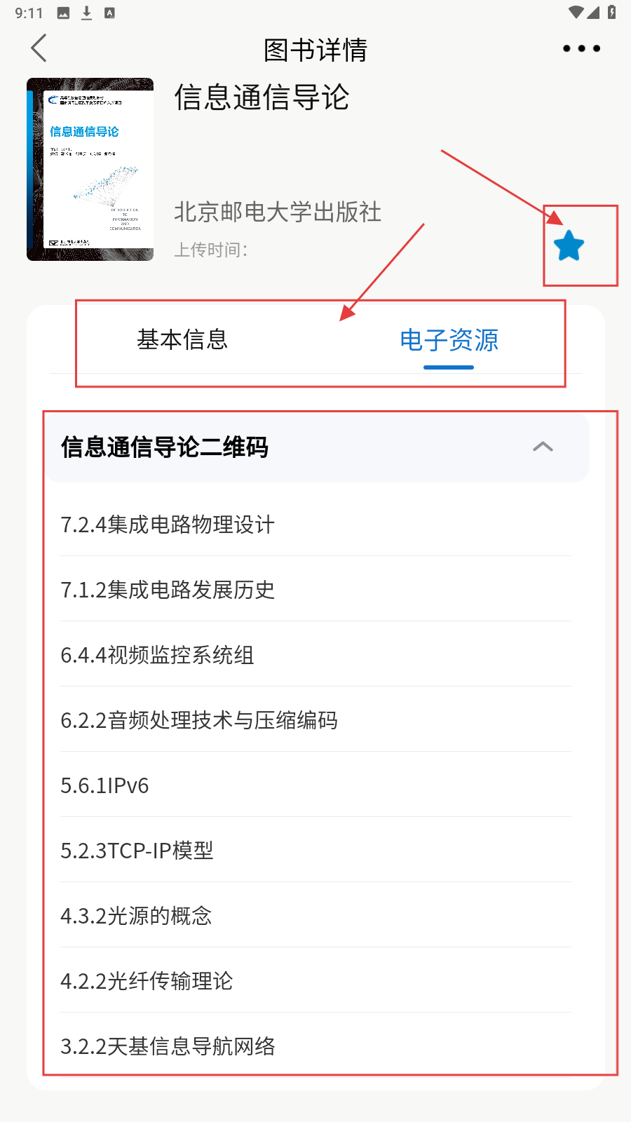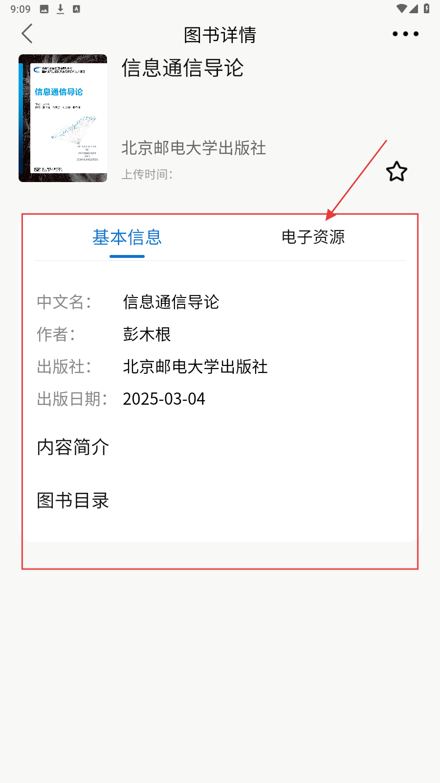 2、在【图书详情】页面,可查看图书的基本信息和电子资源,了解图书内容。