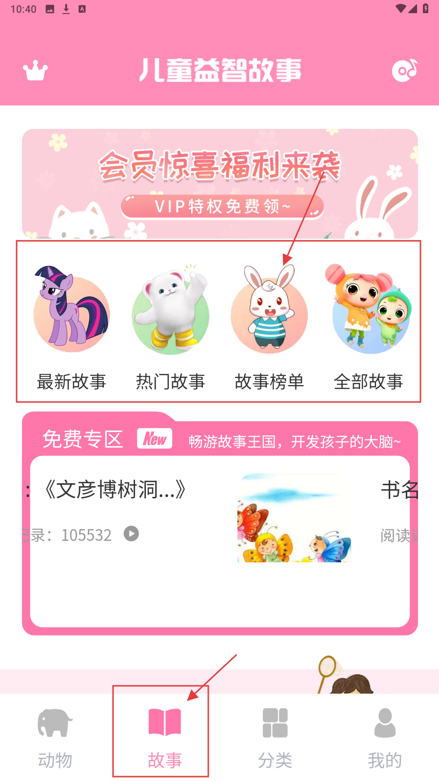 1、在【儿童益智故事】界面,可选择【最新故事】【热门故事】等分类,开启故事之旅。