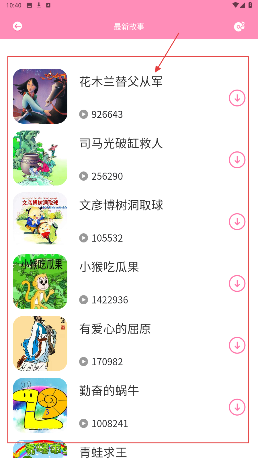 2、在【最新故事】列表中,可看到《花木兰替父从军》等故事,点击即可播放。