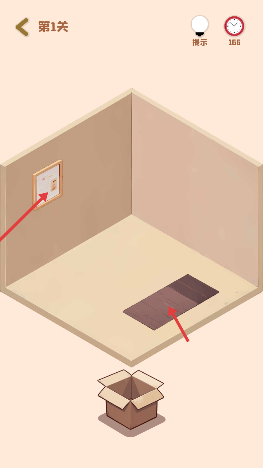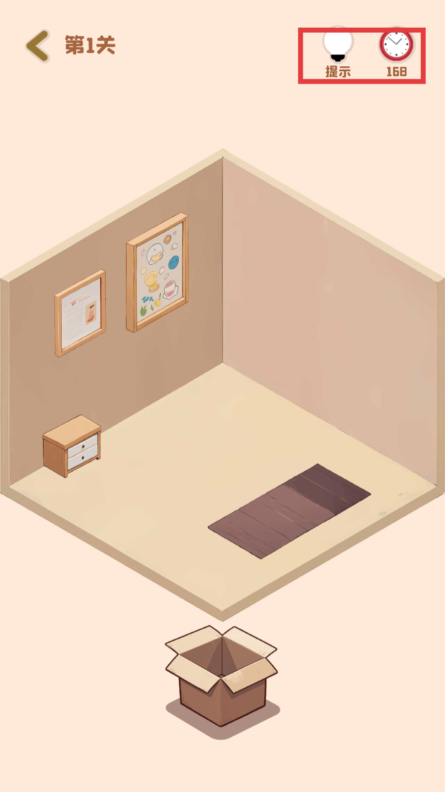 3、继续布置房间,我们要争取在规定时间【168】内完成,如果实在没头绪,就点击【提升】,获取线索。