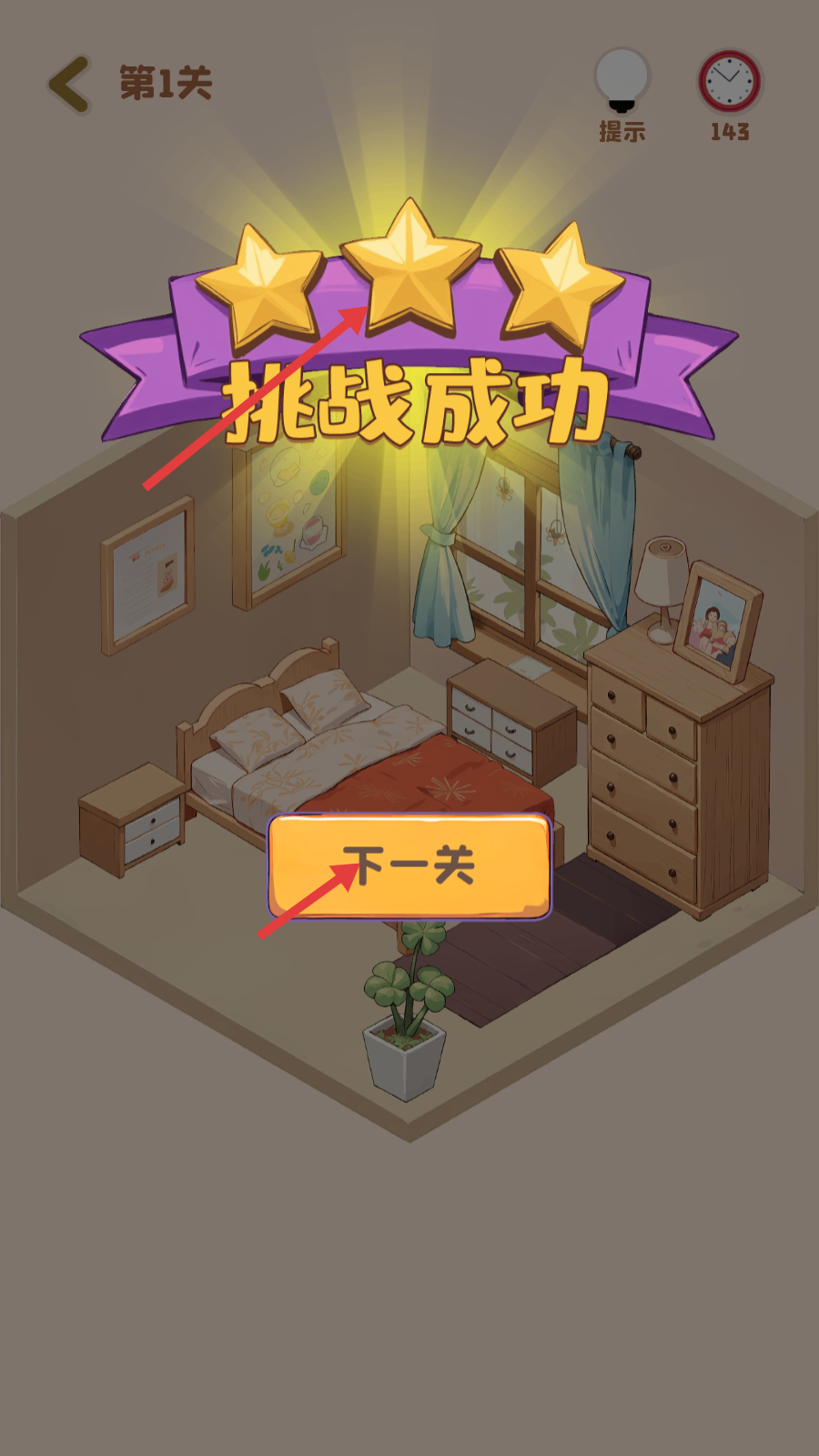 4、成功布置房间获得【3】星评价后,点击【下一关】按钮,开启新的关卡挑战。