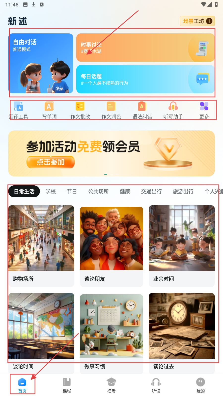 1、在【首页】界面,可选择【自由对话】【时事讨论】等分类,开启英语对话练习。