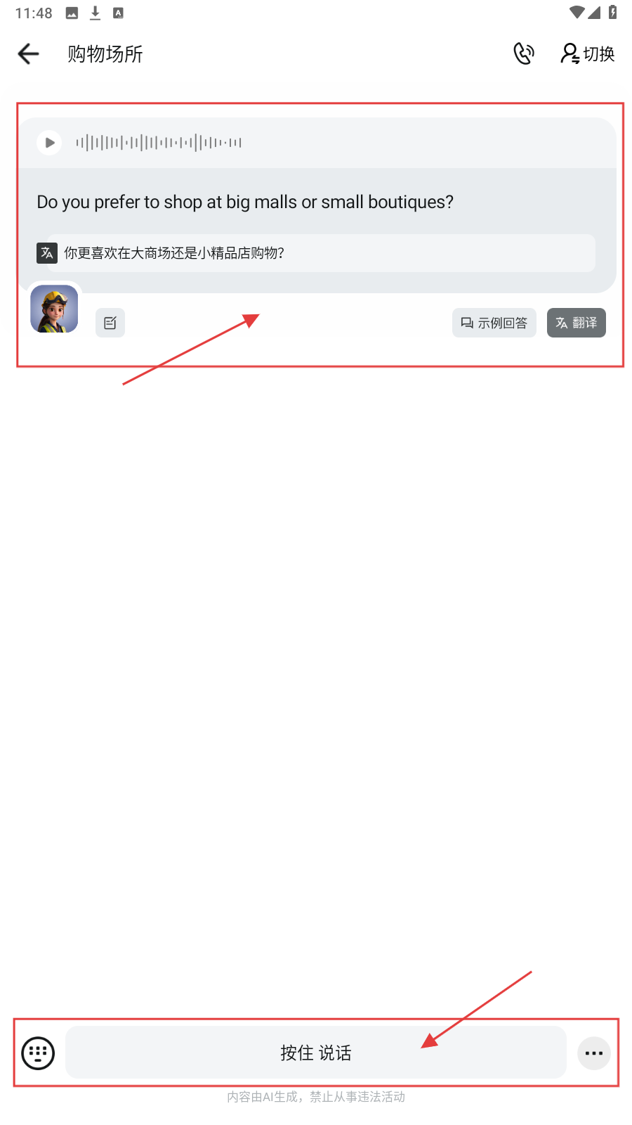2、在对话练习页面,可看到英文问题和中文翻译,点击【按住说话】按钮,进行语音回答,提升口语表达能力。