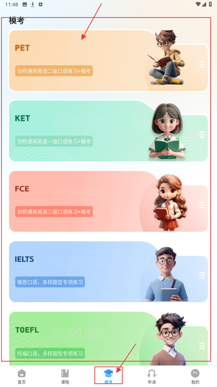 3、在【模考】界面,可选择【PET】【KET】等考试分类,进行口语模考练习,熟悉考试题型。
