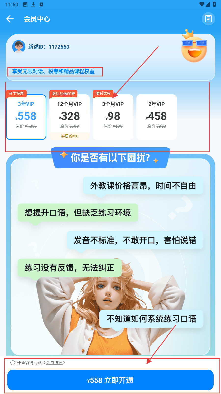 4、在【会员中心】界面,可看到多种会员套餐,选择合适的套餐后,点击【立即开通】按钮,即可开通会员,享受更多权益。