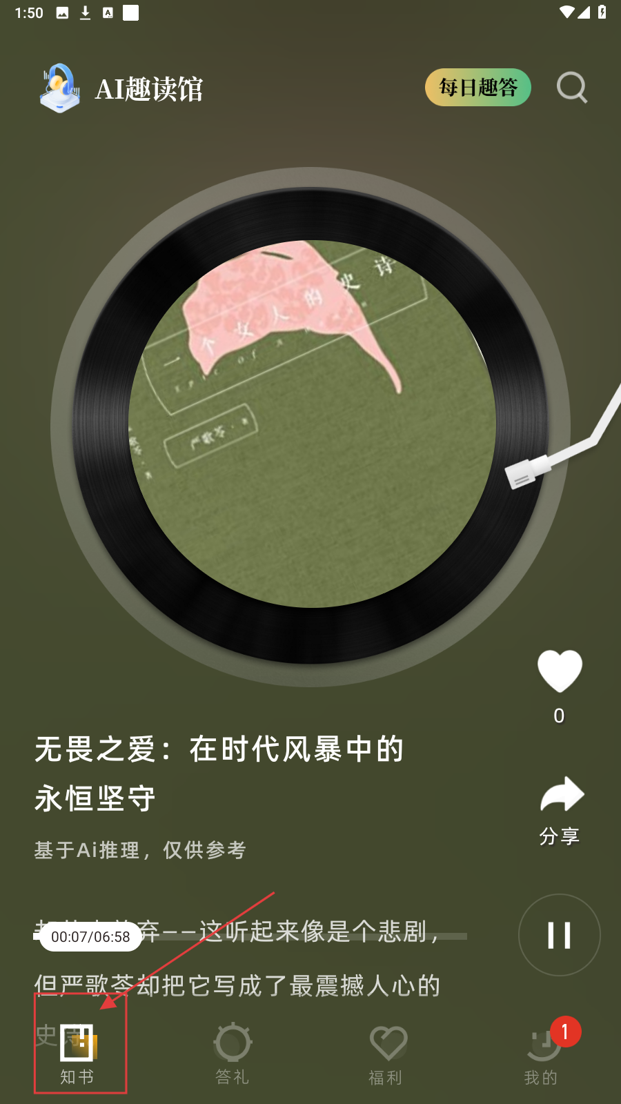 1、进入应用,在【知书】页面可以上下滑动选择感兴趣的内容进行收听。