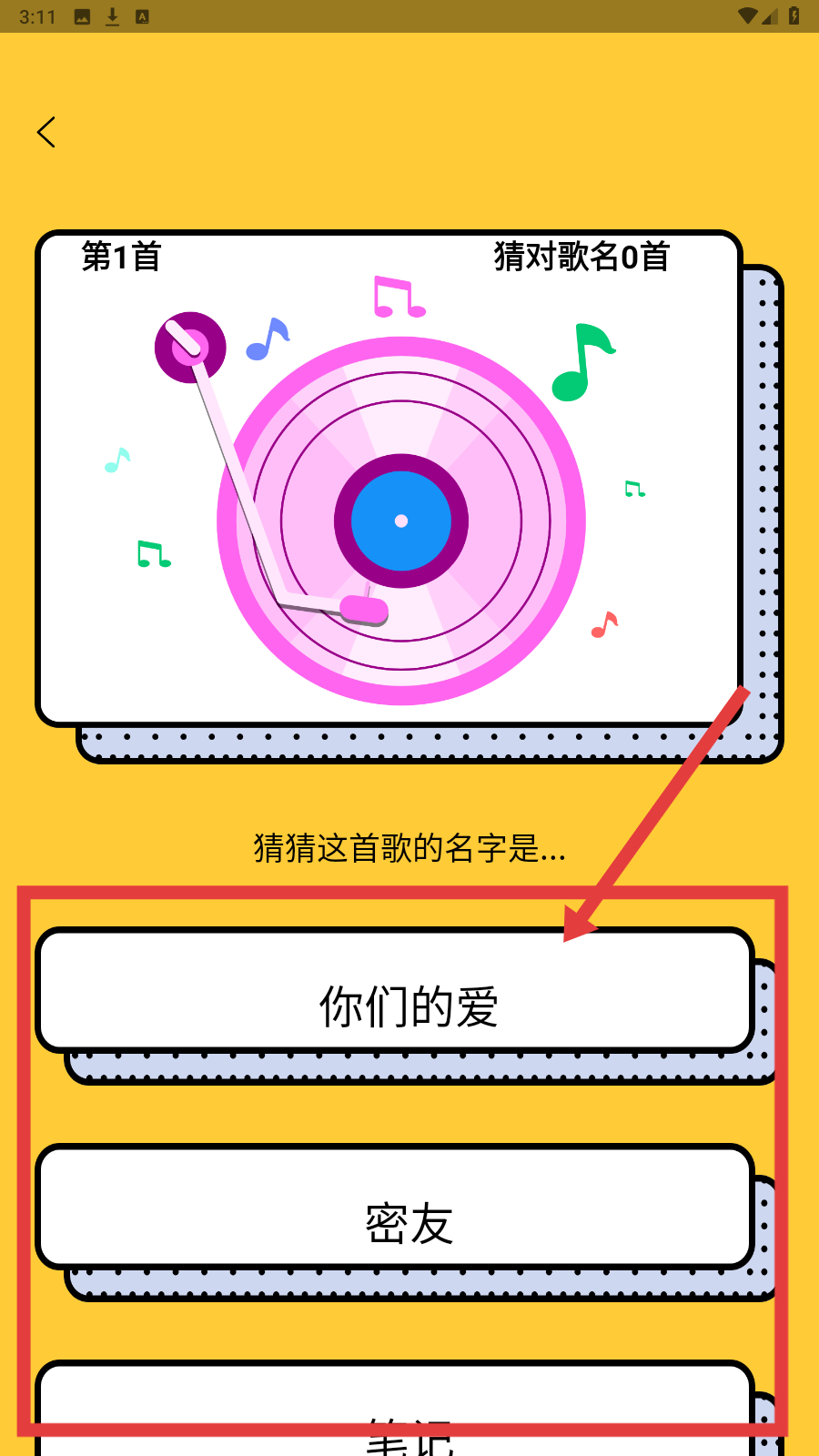1、进入软件后,根据播放的音乐,从下方选项中选择正确的歌名,完成第一关挑战。
