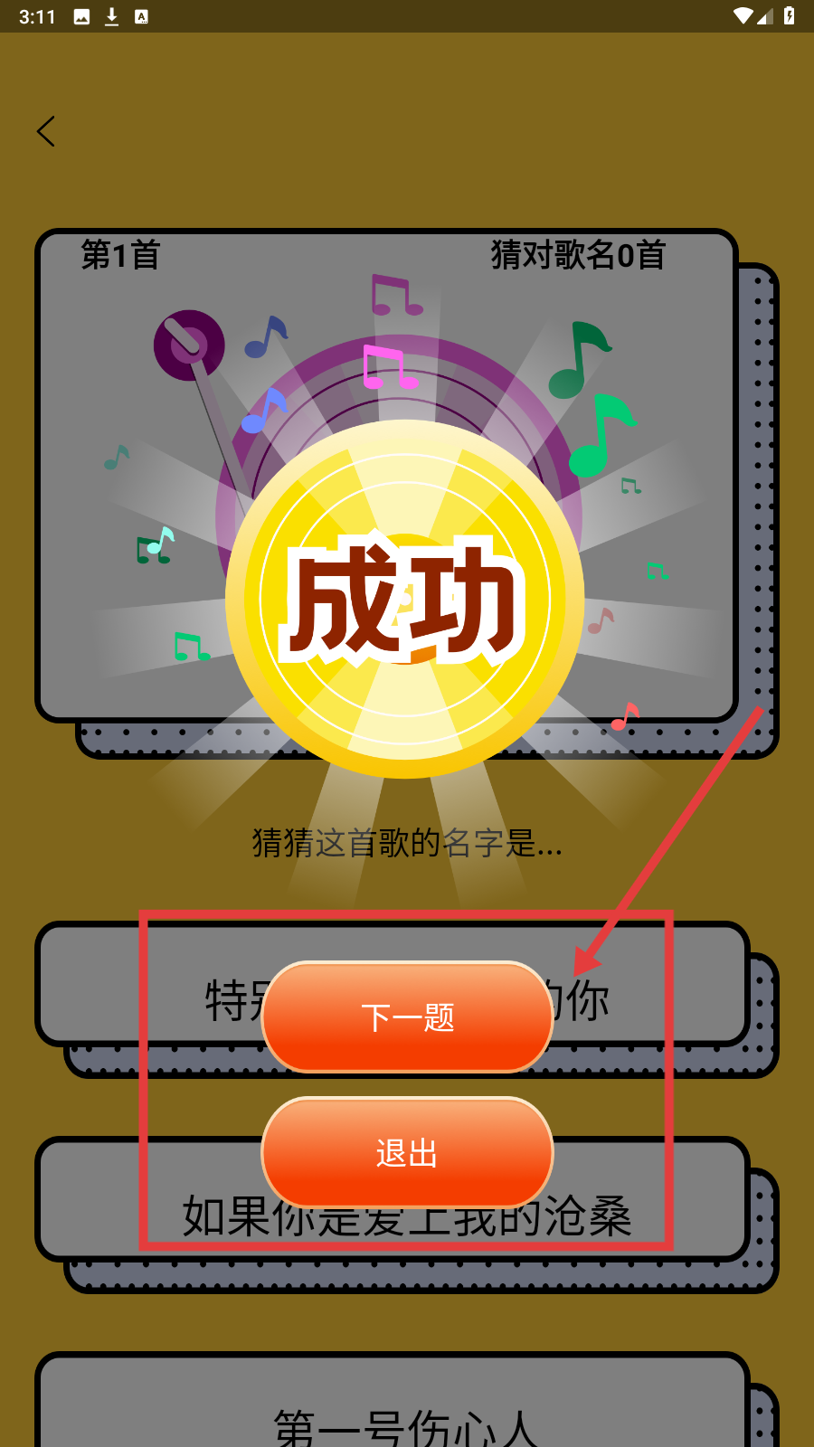 2、成功猜对歌名后,点击【下一题】按钮,继续挑战下一首歌曲的歌名猜测。