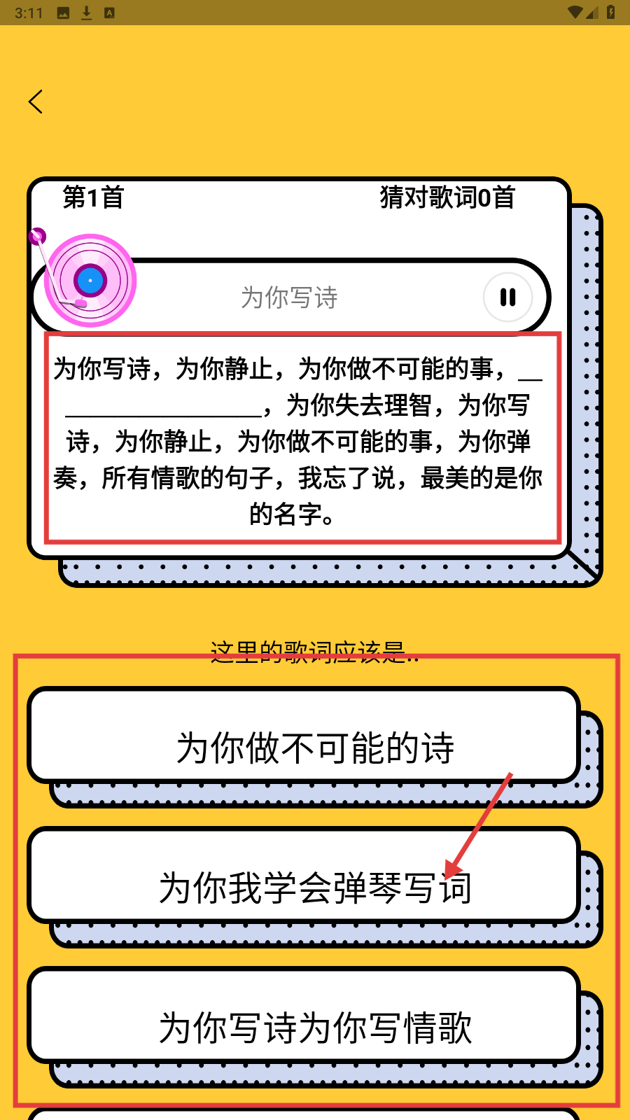 3、若遇到歌词填空题目,根据对歌曲的熟悉程度,从下方选项中选择正确的歌词填入。