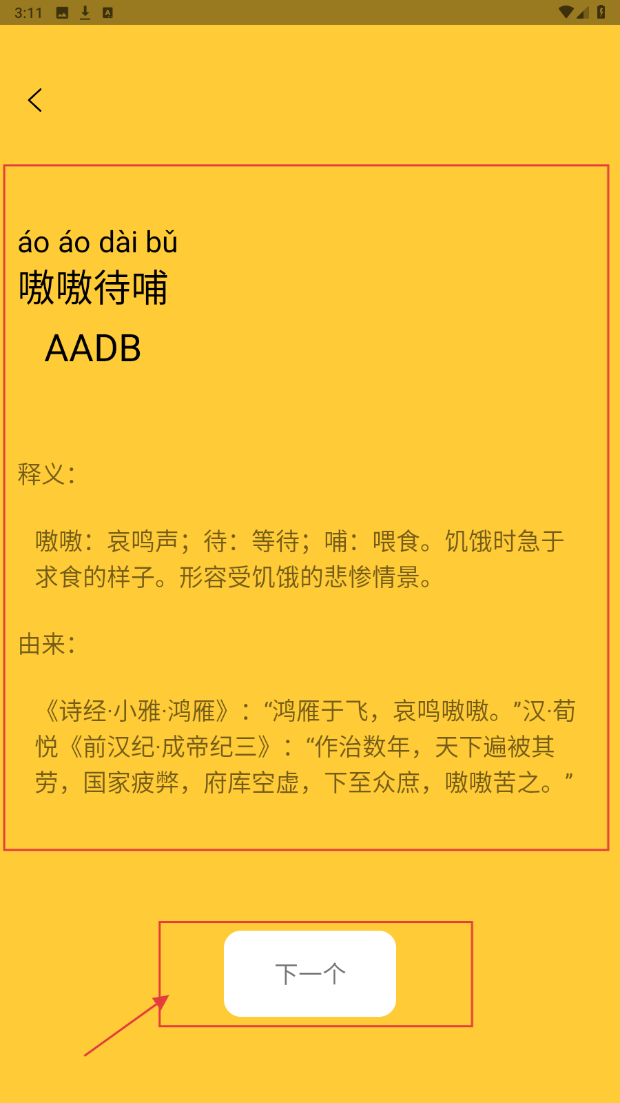 4、还可以进行成语学习,完成当前内容学习后,点击【下一个】按钮,继续学习下一个新的内容。