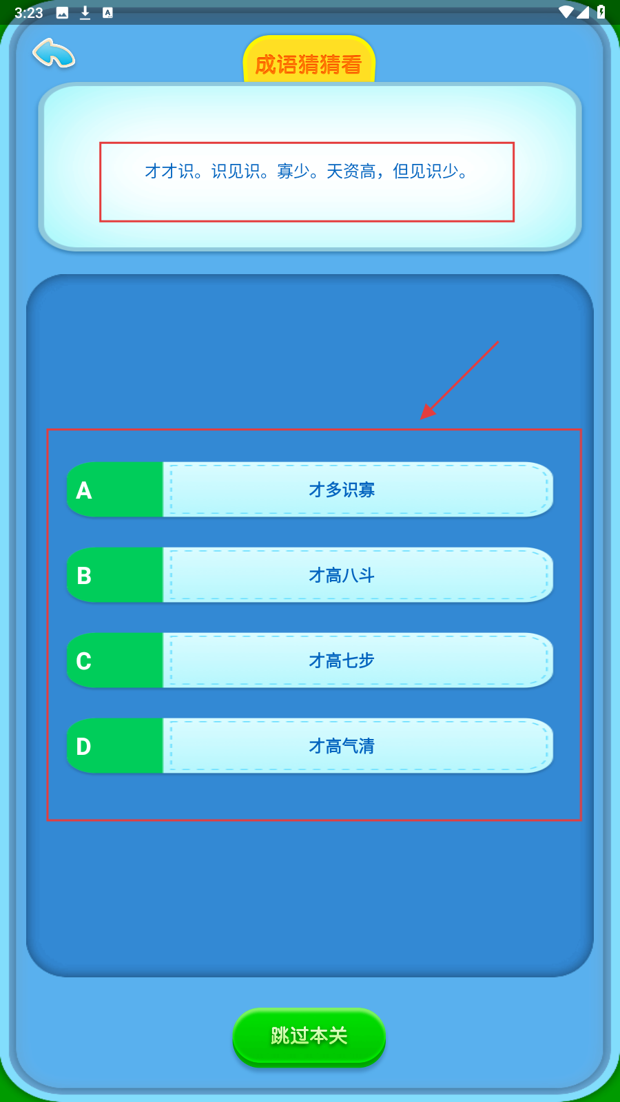1、根据题目描述,从选项中选择符合“才才识。识见识。寡少。天资高,但见识少”的成语。