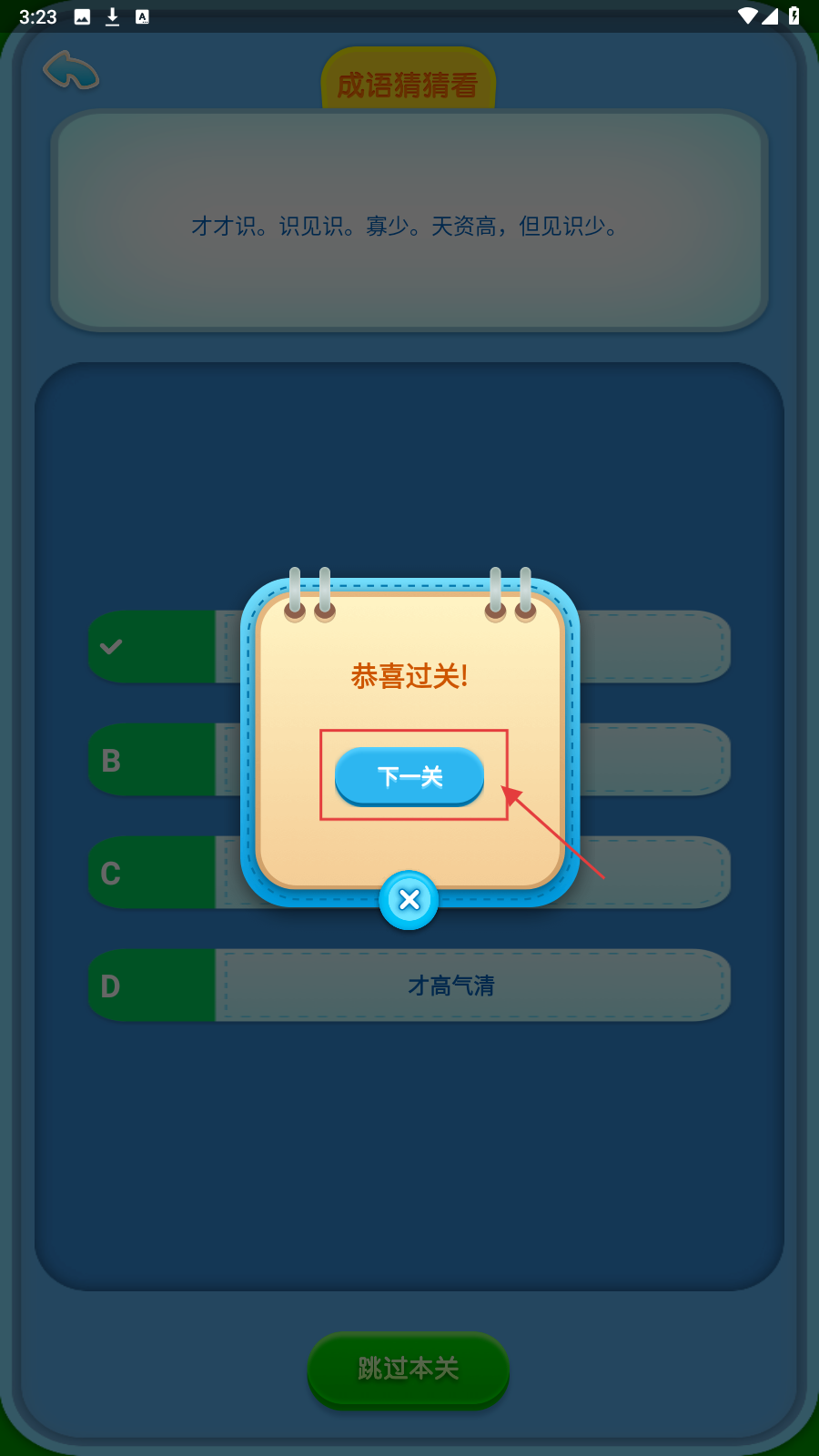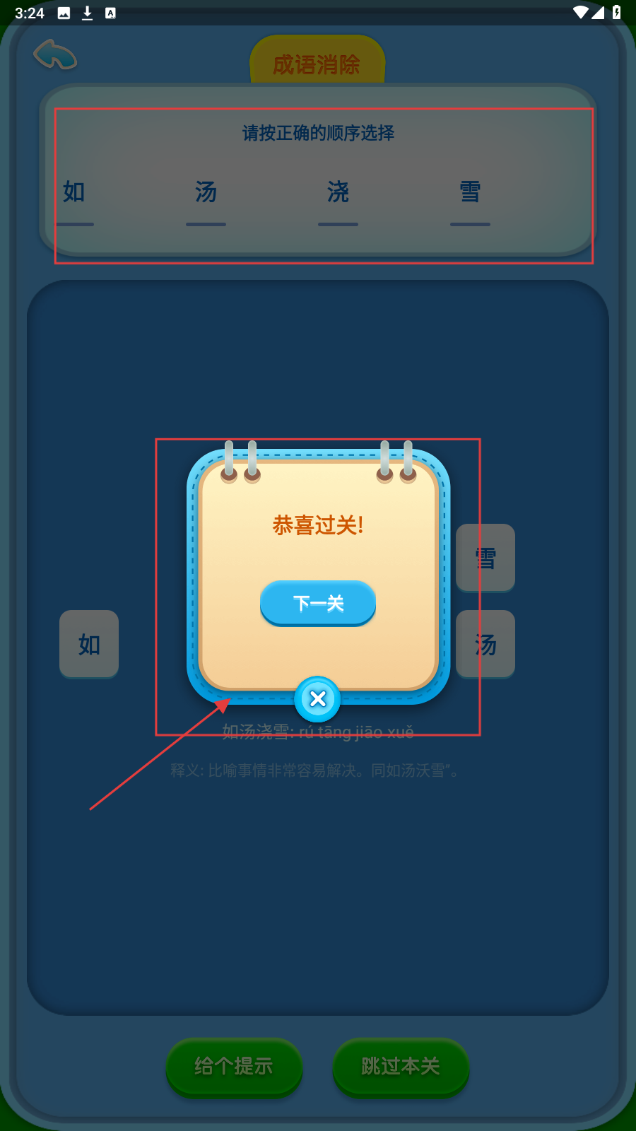 2、成功通关后,点击【下一关】按钮,继续挑战下一个成语题目。