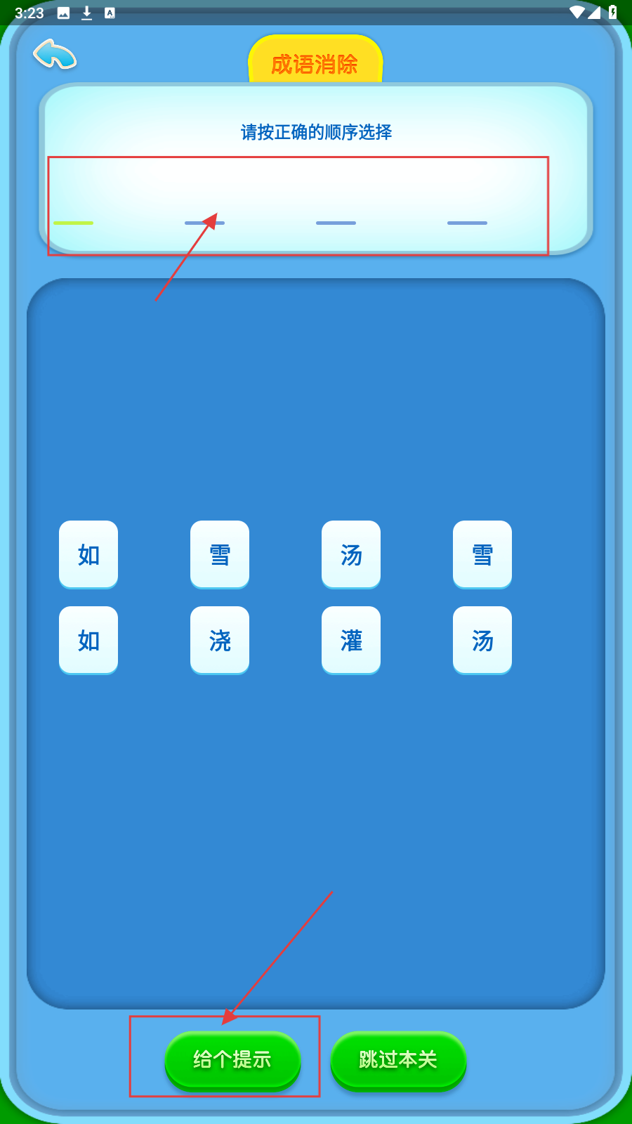 3、若遇到成语消除题目,如若不会,可以点击【给个提示】按提示的正确顺序选择组成成语的字,完成题目。