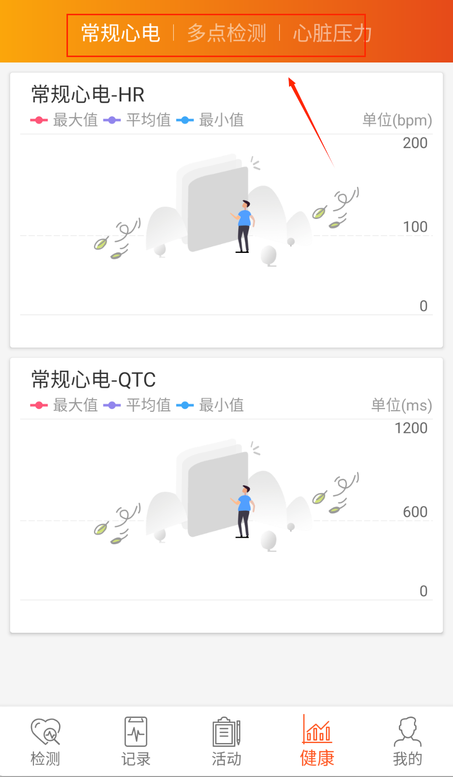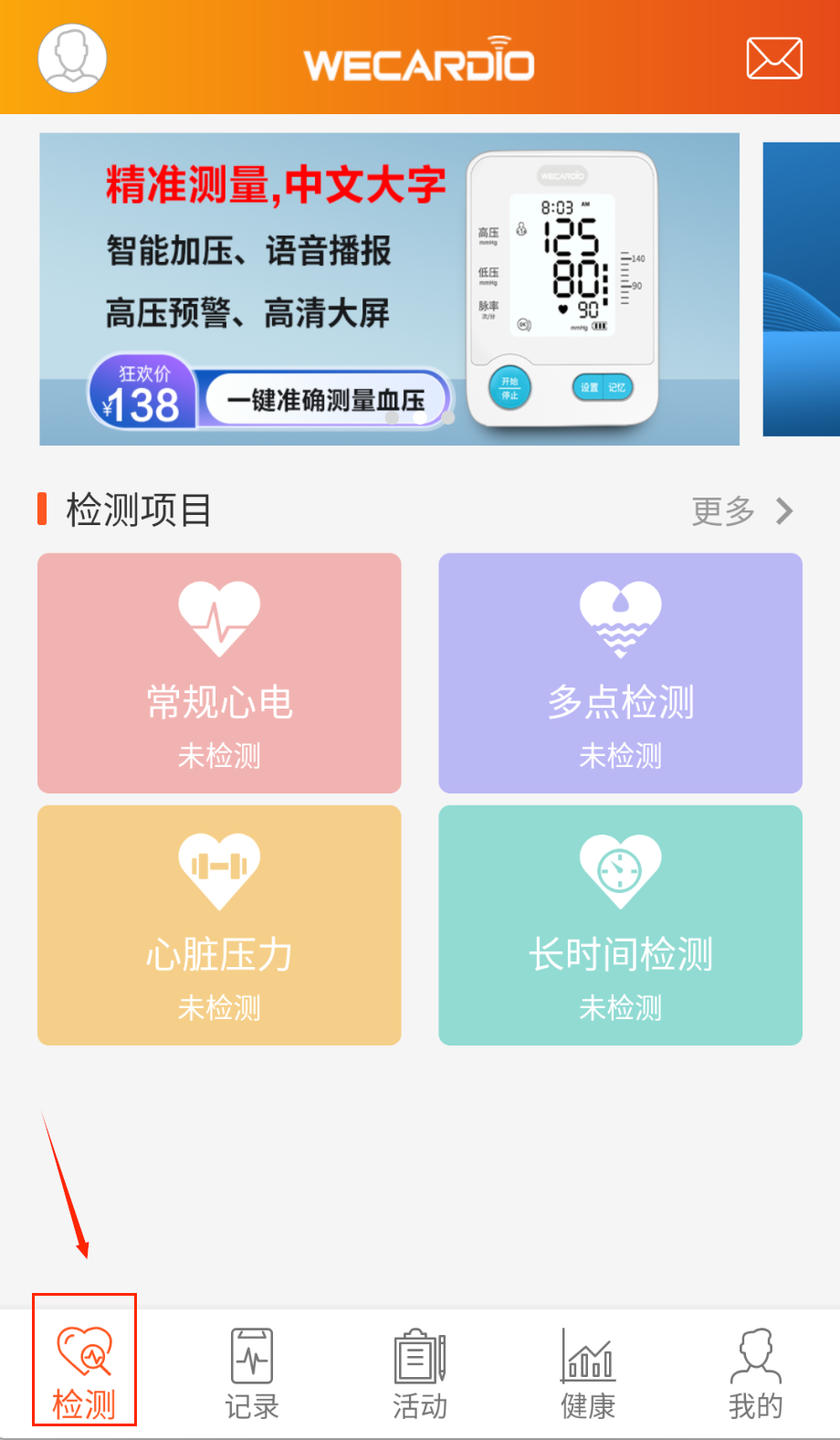 2、检测页实时查看心电图波形,监测血压血氧数据,记录检测时间和身体状况啦。