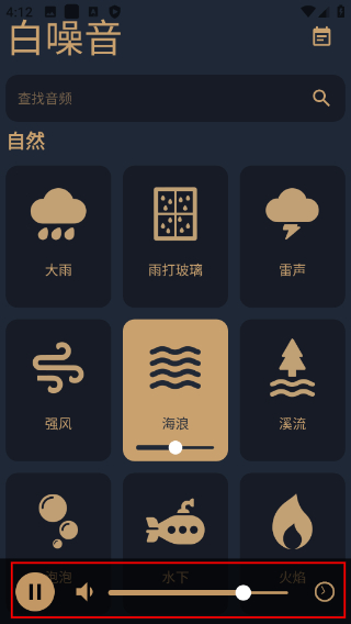4、选定后海浪音频开始播放,可通过底部的暂停按钮控制播放状态,同时调节音量滑块调整音量大小。