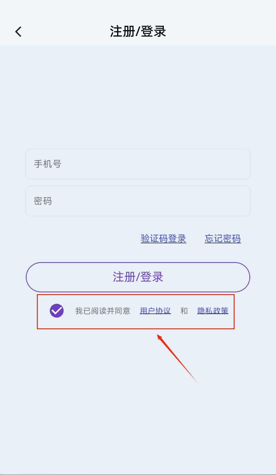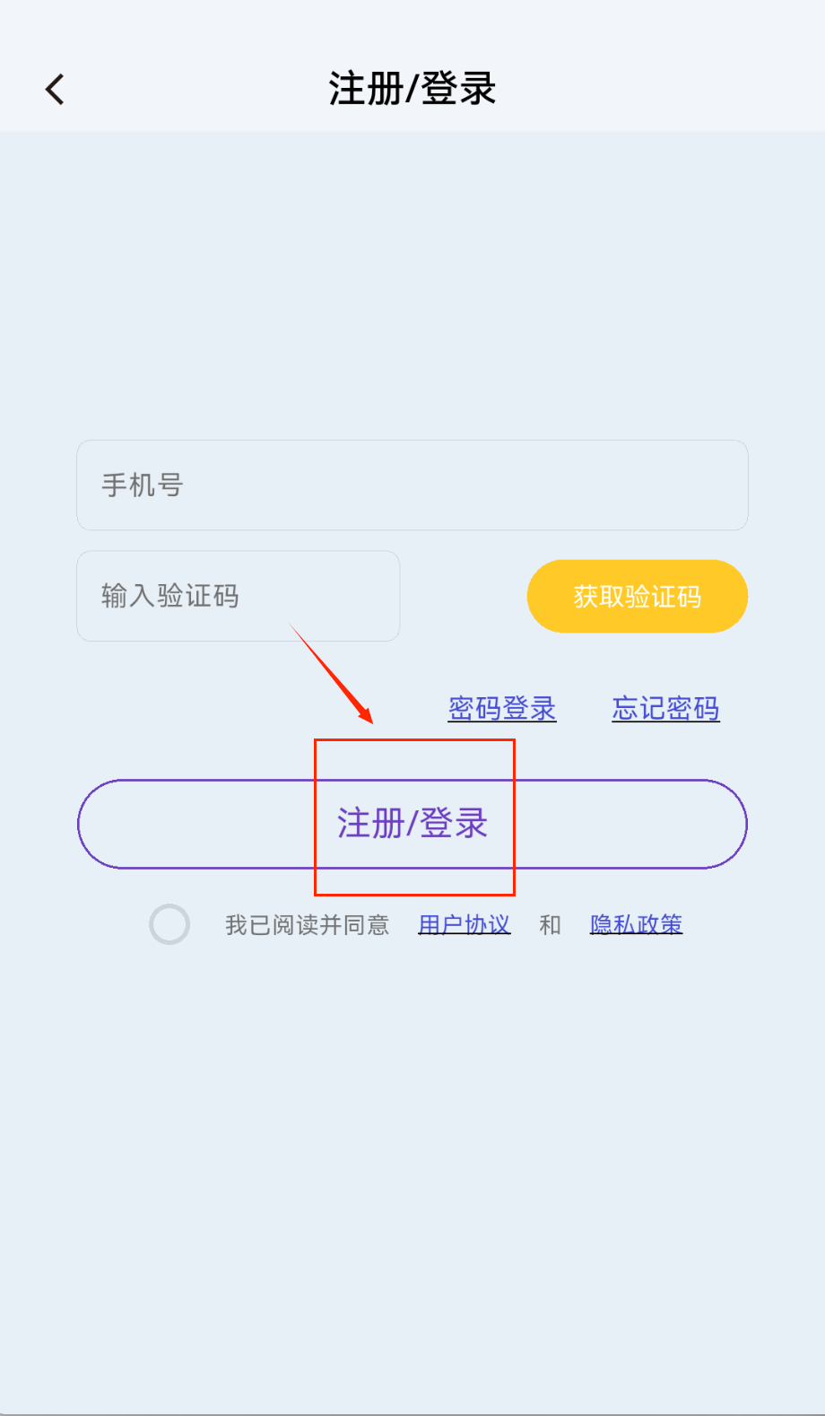 2、注册登录页填手机号和验证码,别忘了勾选底部协议框,紫色大按钮一点就完成啦。