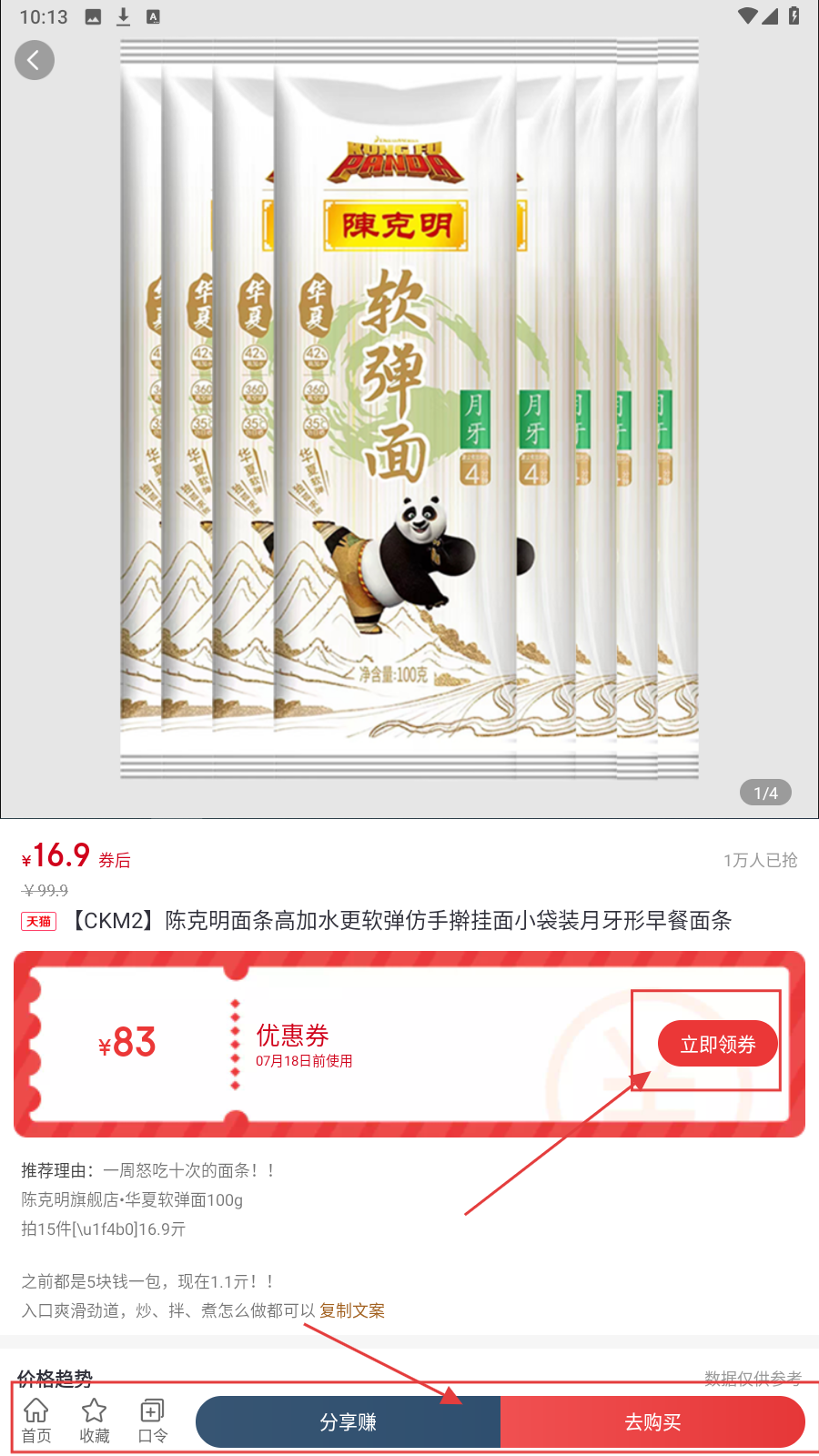 4、选择好商品后,进入商品页面,可以点击【立即领券】领取优惠,在下方可以进行收藏、购买等操作。