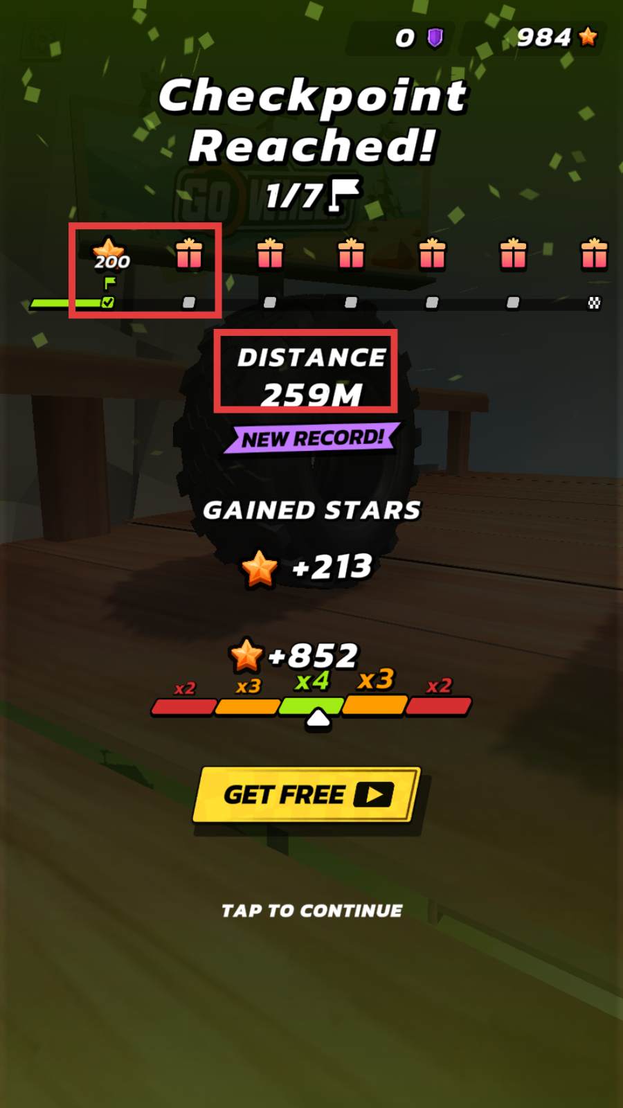 4、抵达检查点后,留意【GAINED-STARS】加成,把握奖励倍数,适时点击【GET-FREE】获取更多资源。