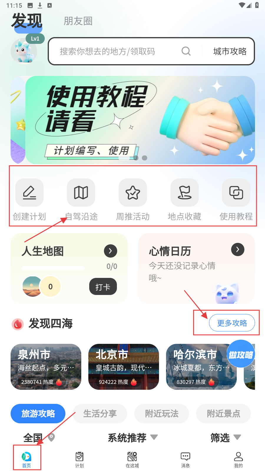 1、进入应用后,点击【更多攻略】按钮,查看更多旅游攻略内容。