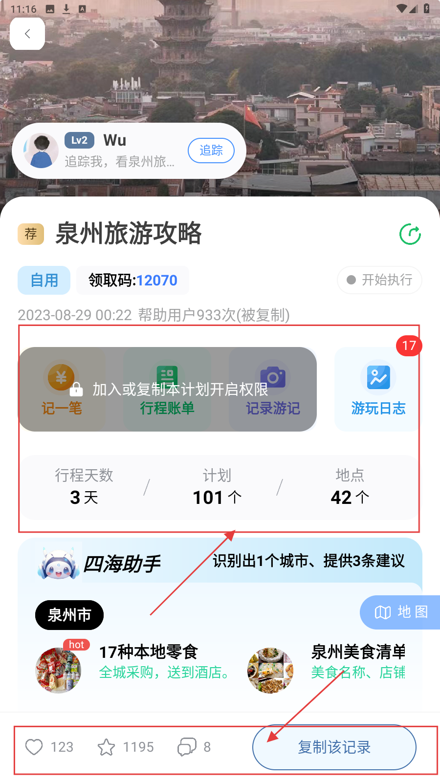 4、查看攻略详情后,点击【复制该记录】按钮,复制攻略内容,方便后续使用。