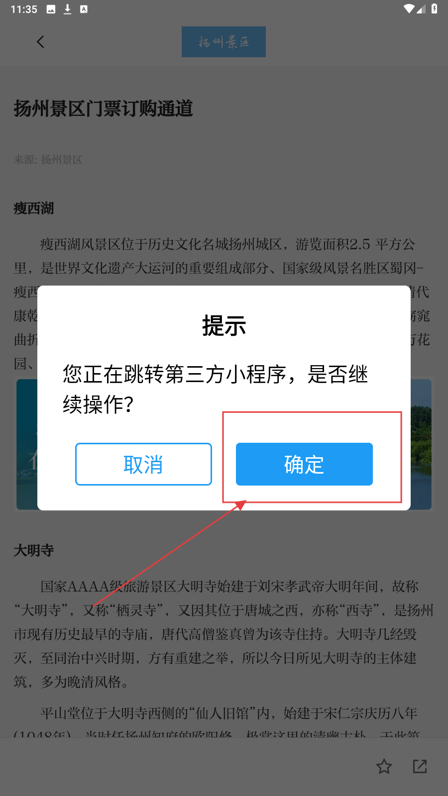 4、在购票页面中,点击【确定】按钮,跳转至第三方小程序完成购票。