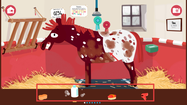 1、刚开始,我们要先用场景下方的道具,清洗马身上的污渍。