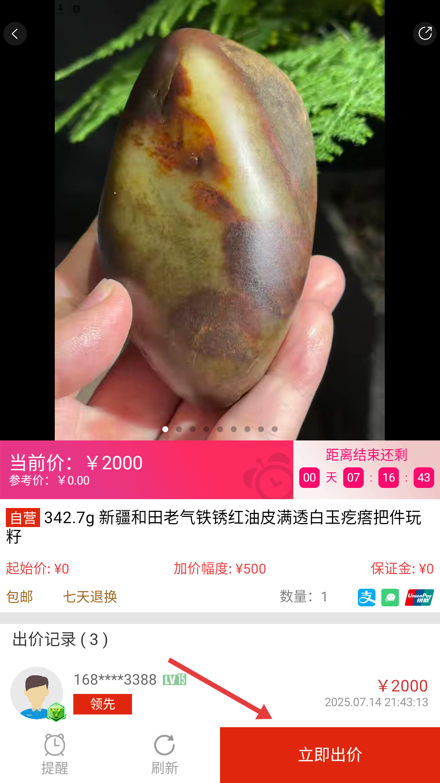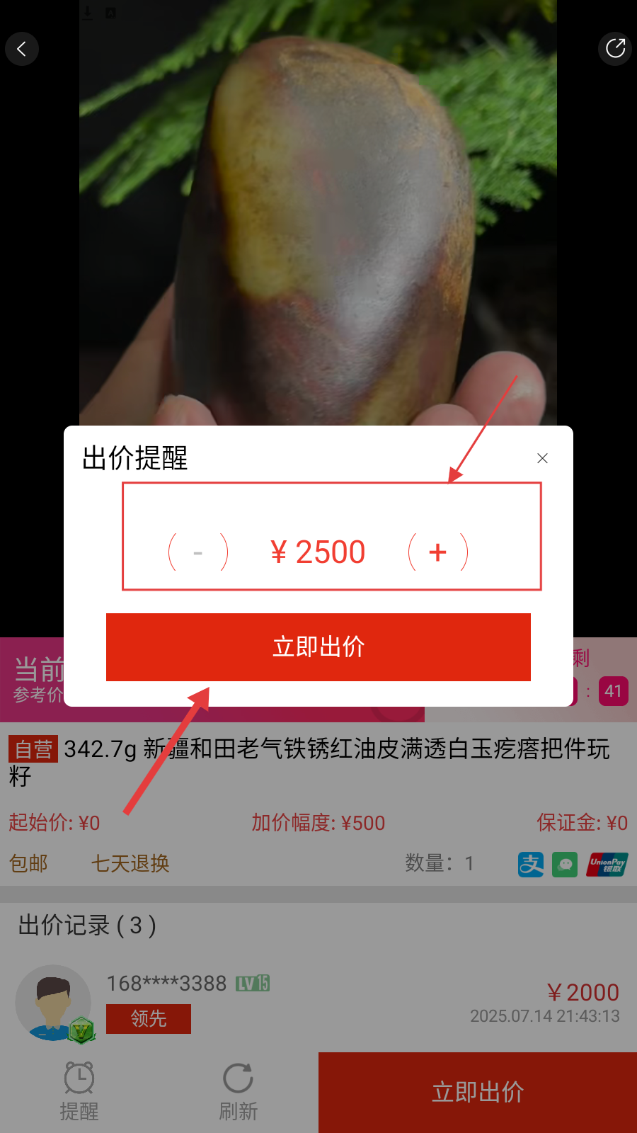 4、在出价页面中,设置出价金额,点击【立即出价】按钮,完成出价。