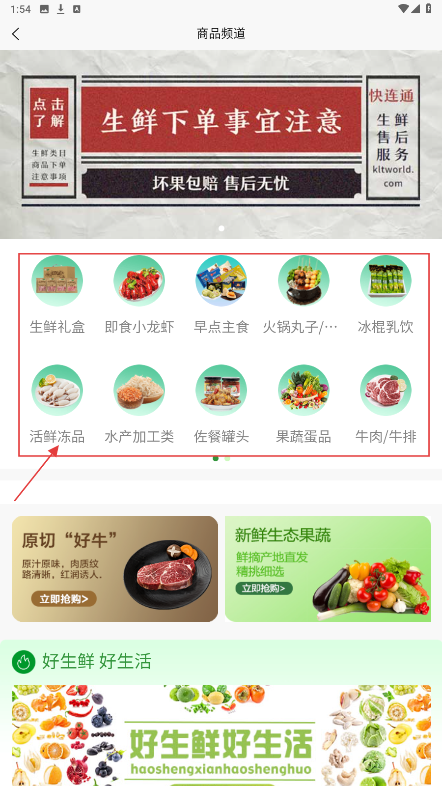 1、进入应用后,选择感兴趣的商品分类,如【肉禽生鲜】,查看推荐商品。