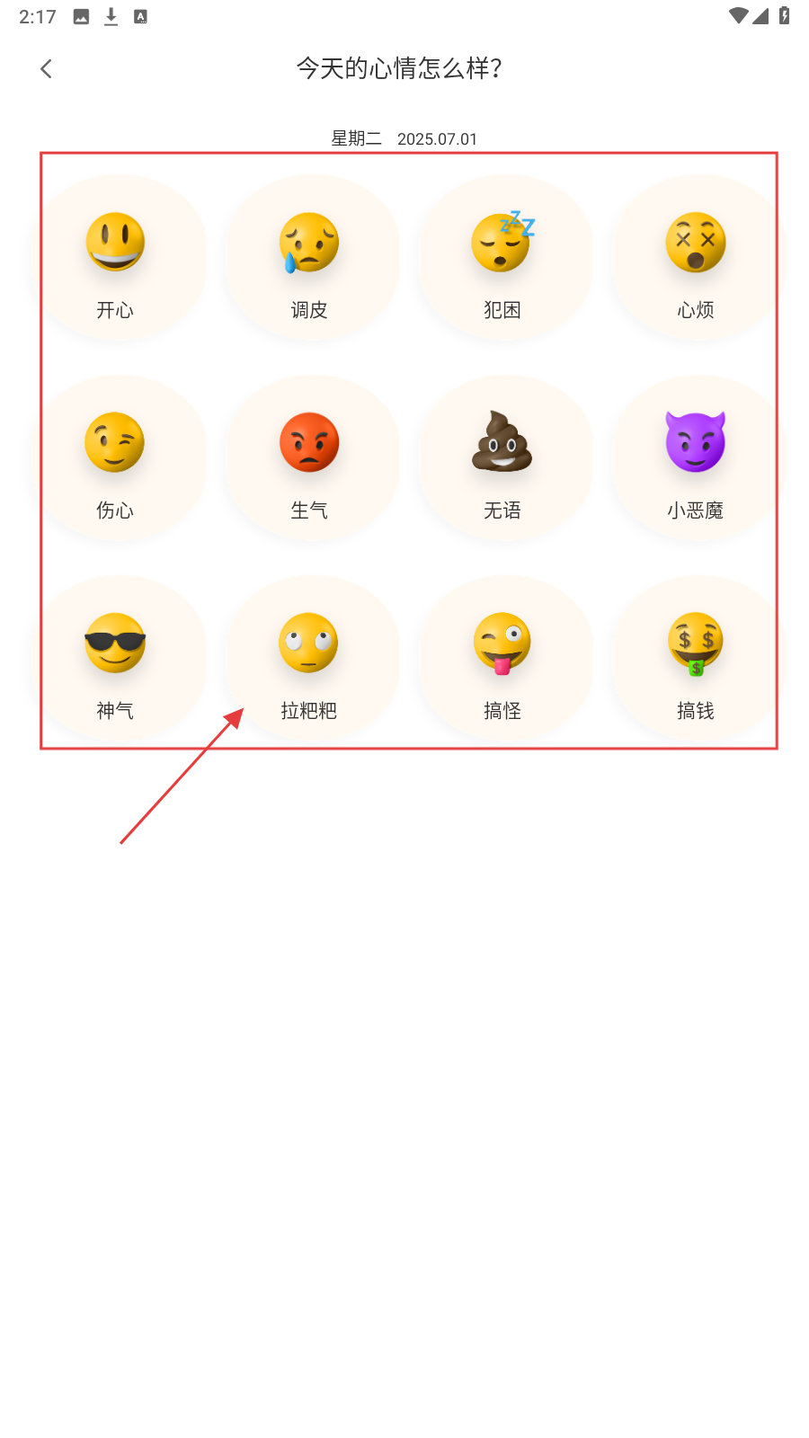 2、在心情选择页面中,选择当天的心情,如【开心】。