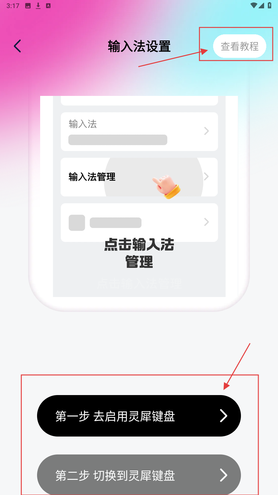 2、在输入法设置页面中,点击【查看教程】按钮,查看灵犀键盘的使用教程。