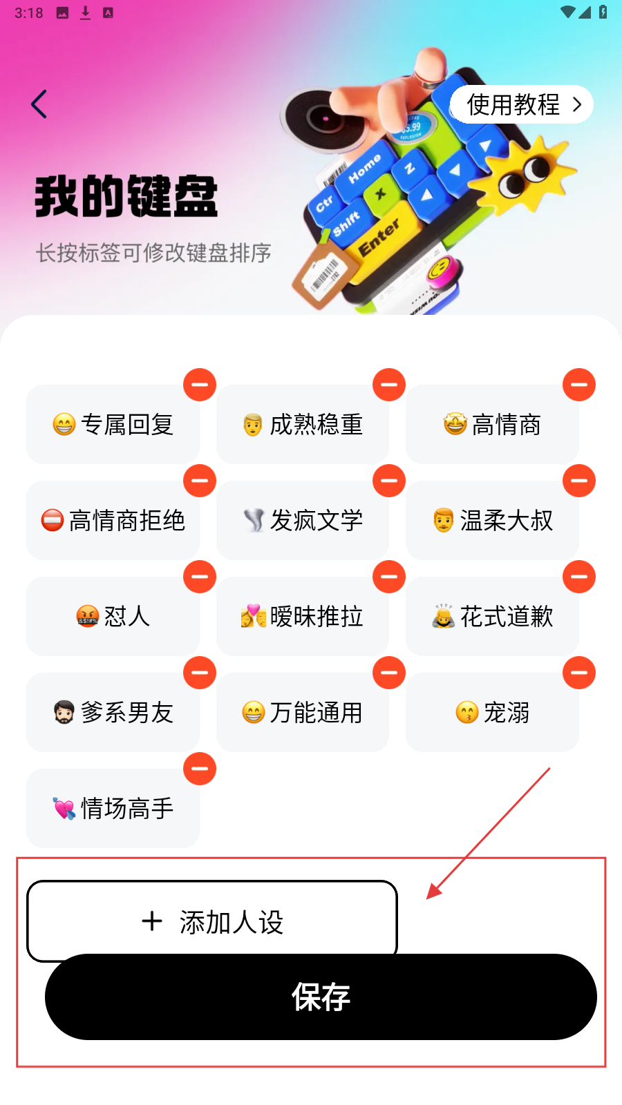 4、键盘设置完成后,点击【添加人设】按钮,添加喜欢的人设,点击【保存】按钮,保存人设设置。