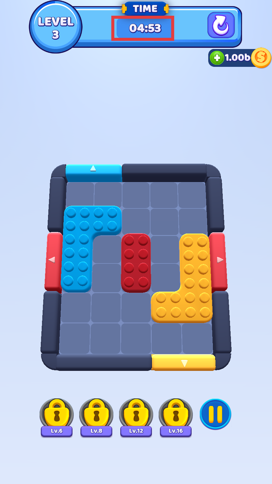 2、注意屏幕上方的倒计时,在规定时间(如5分钟)内完成积木块的移动操作,成功通关可获得金币奖励。