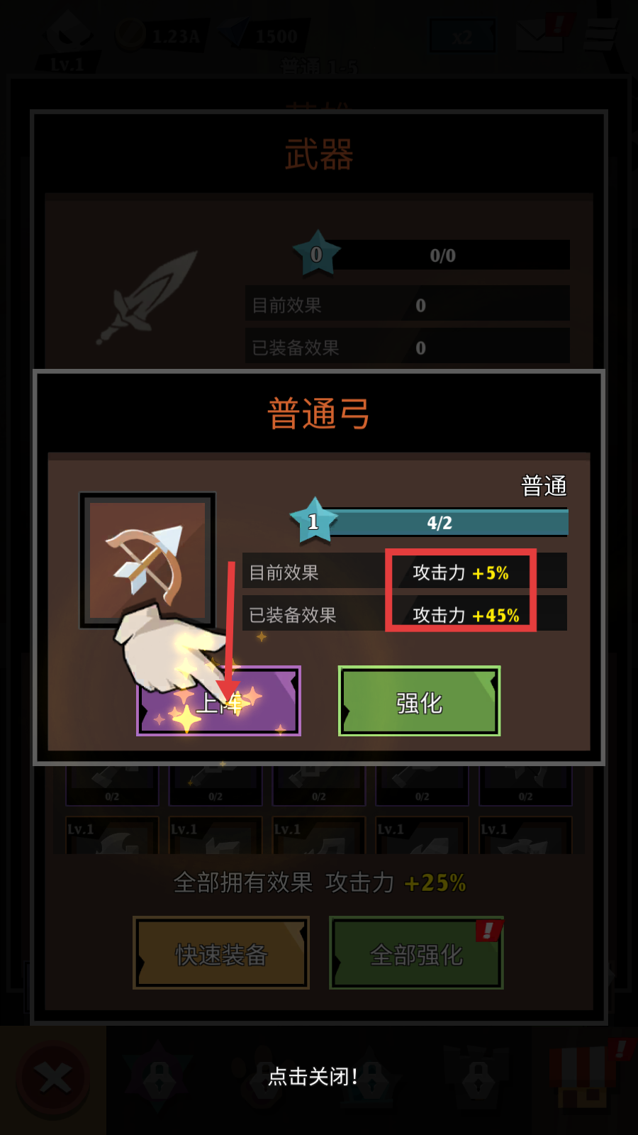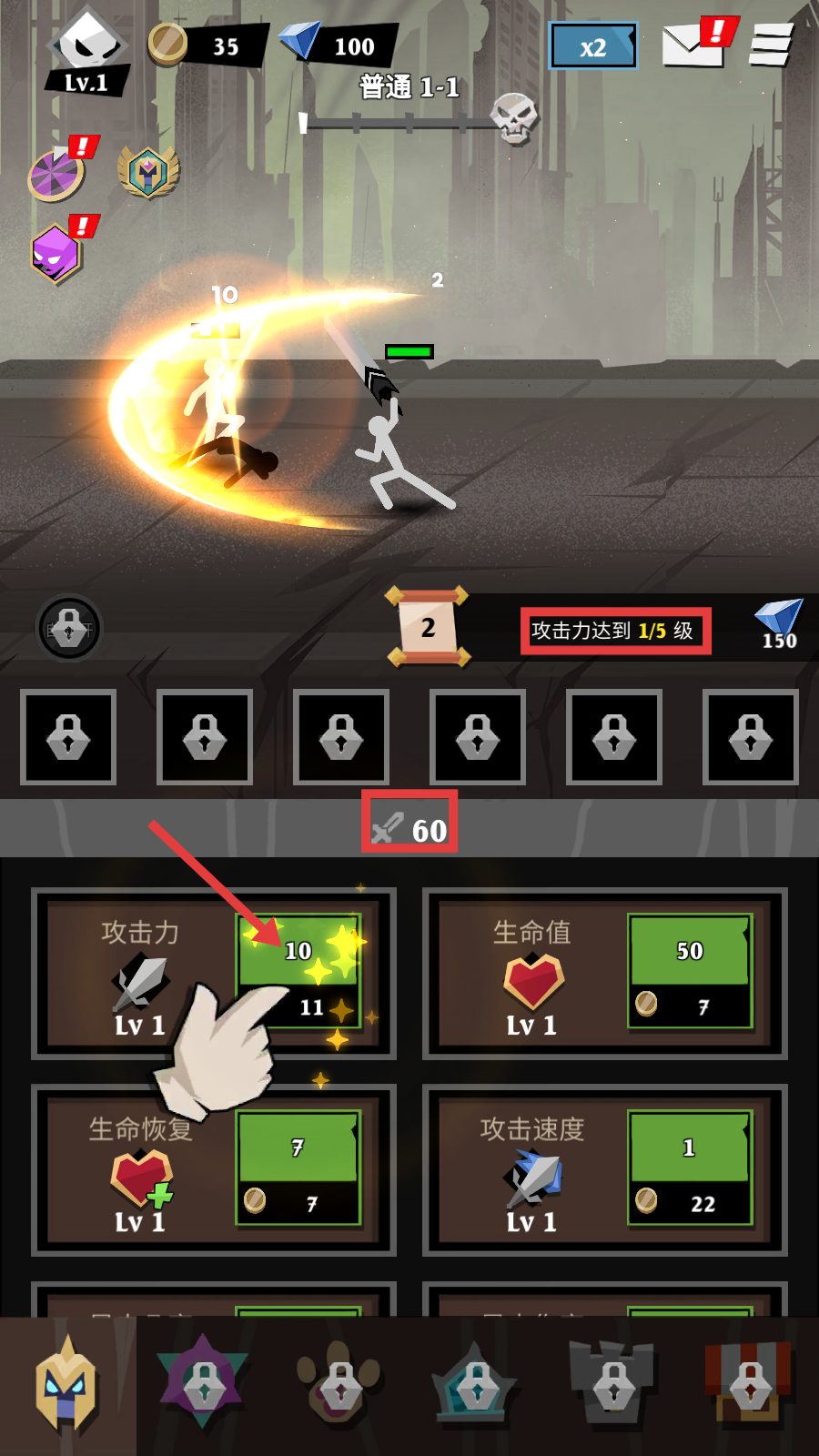 1、关注屏幕下方属性栏,优先用金币提升【攻击力】,达到【1/5级】解锁更多功能。