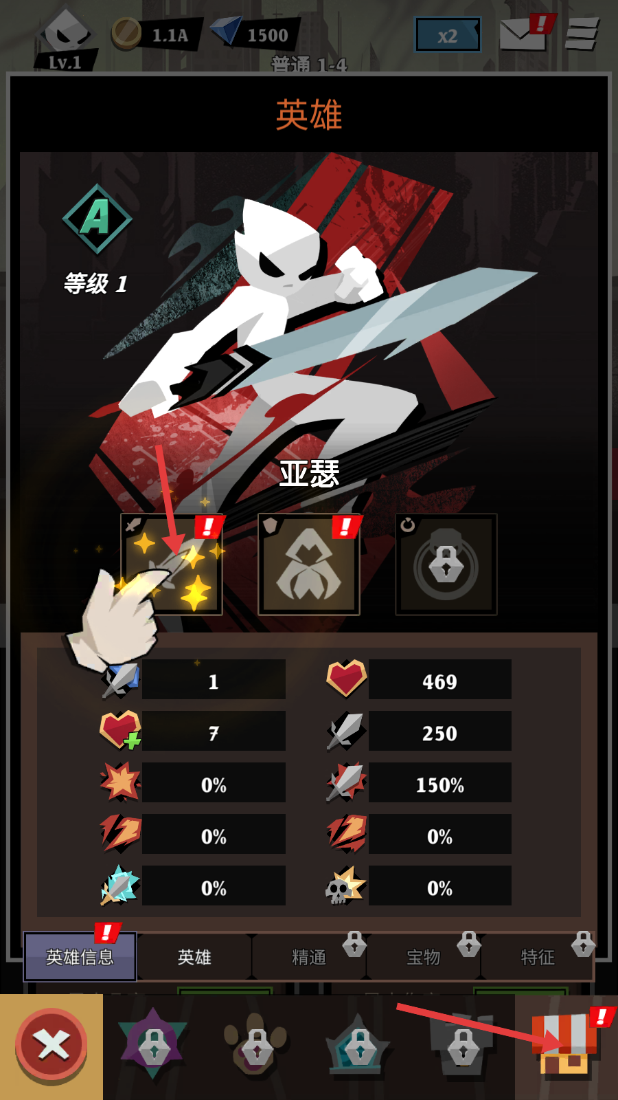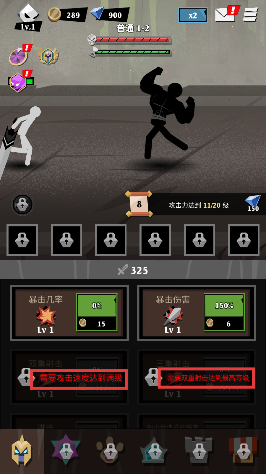 2、推进关卡时,留意属性需求,如【攻击力达到11/20级】,同时积累金币提升【暴击几率】等属性。