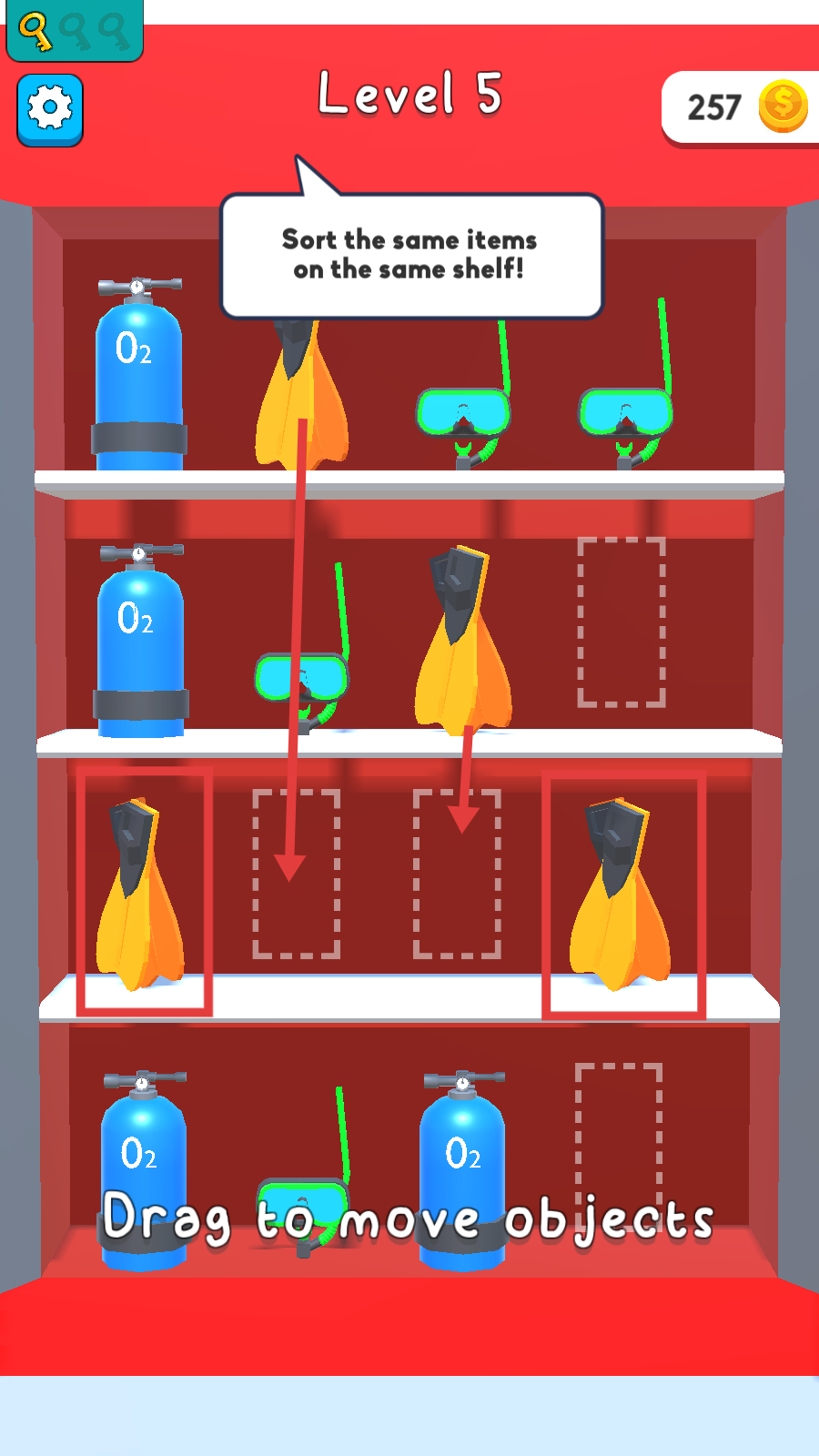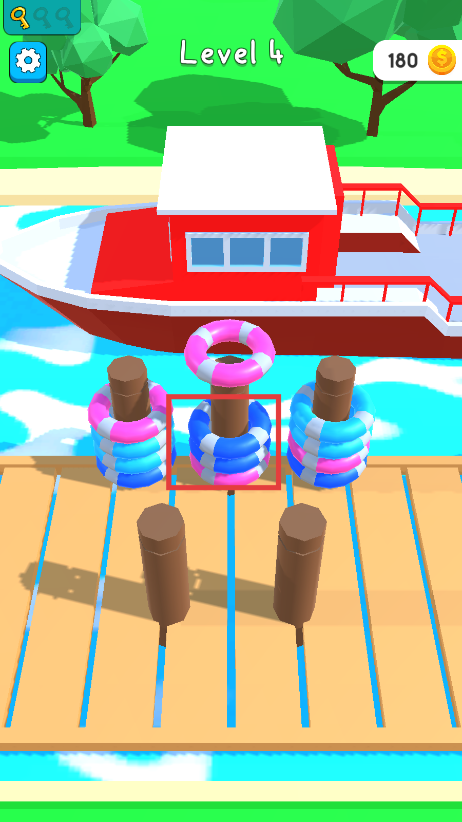 2、进入【Level-4】,观察场景中物件,按要求整理,把相同颜色的游泳圈放在同一个木桩里。