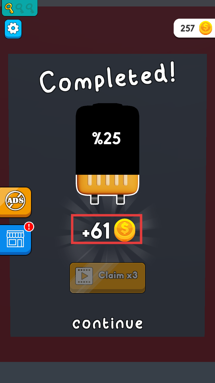 4、成功通关后,领取【+61-$】奖励,可点击【Claim-x3】三倍获取,积累金币用于后续关卡。