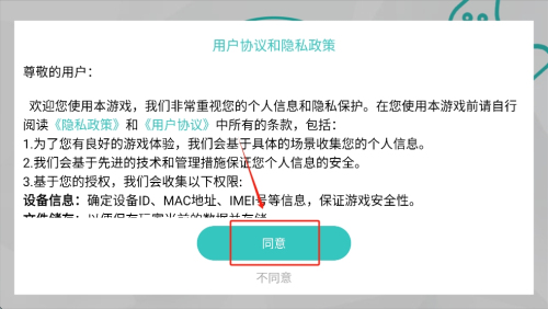 1、点击“同意”按钮以接受用户协议和隐私政策,开始游戏。