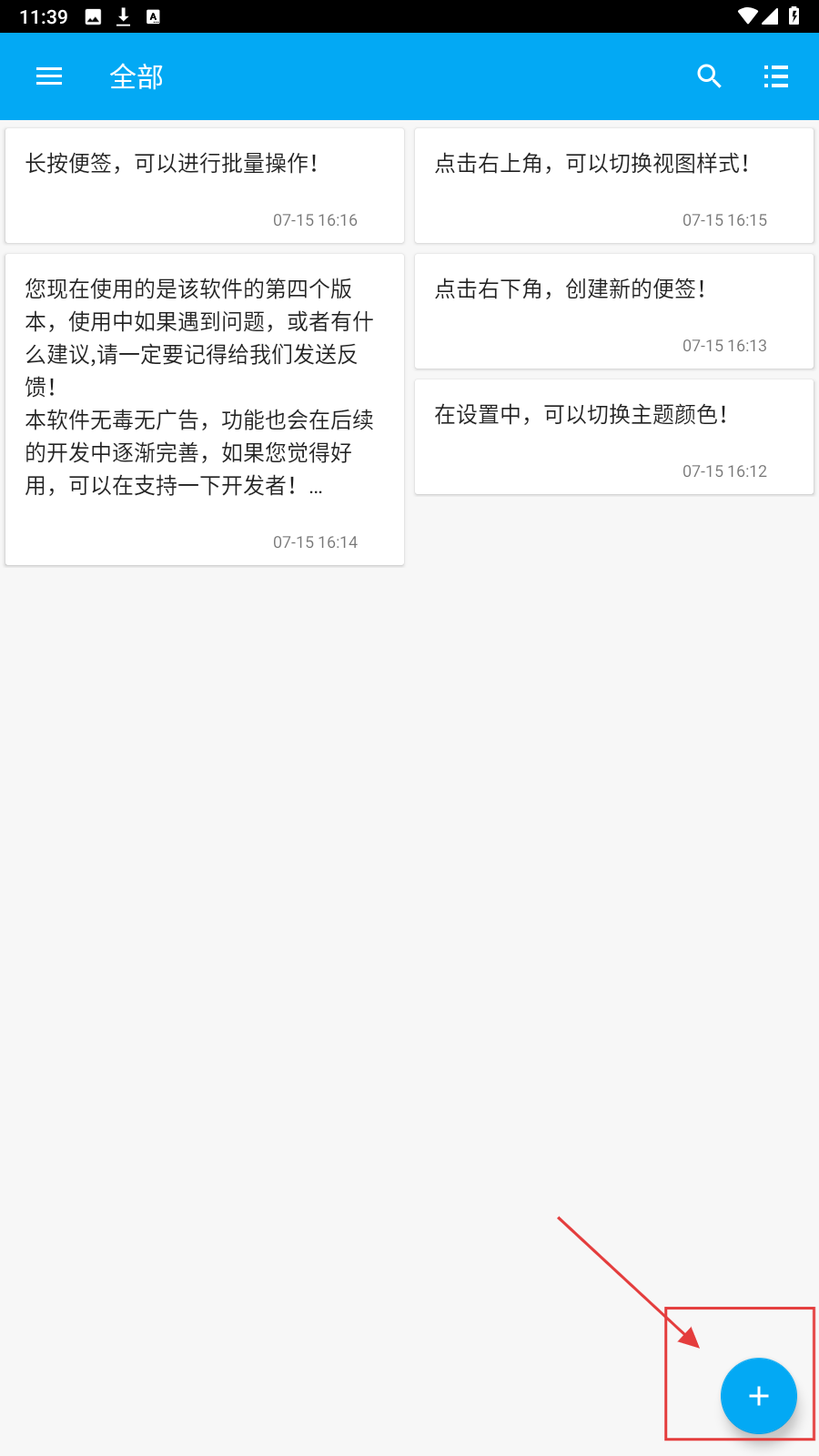 1、进入应用后,点击右下角的【+】按钮,创建新的便签。