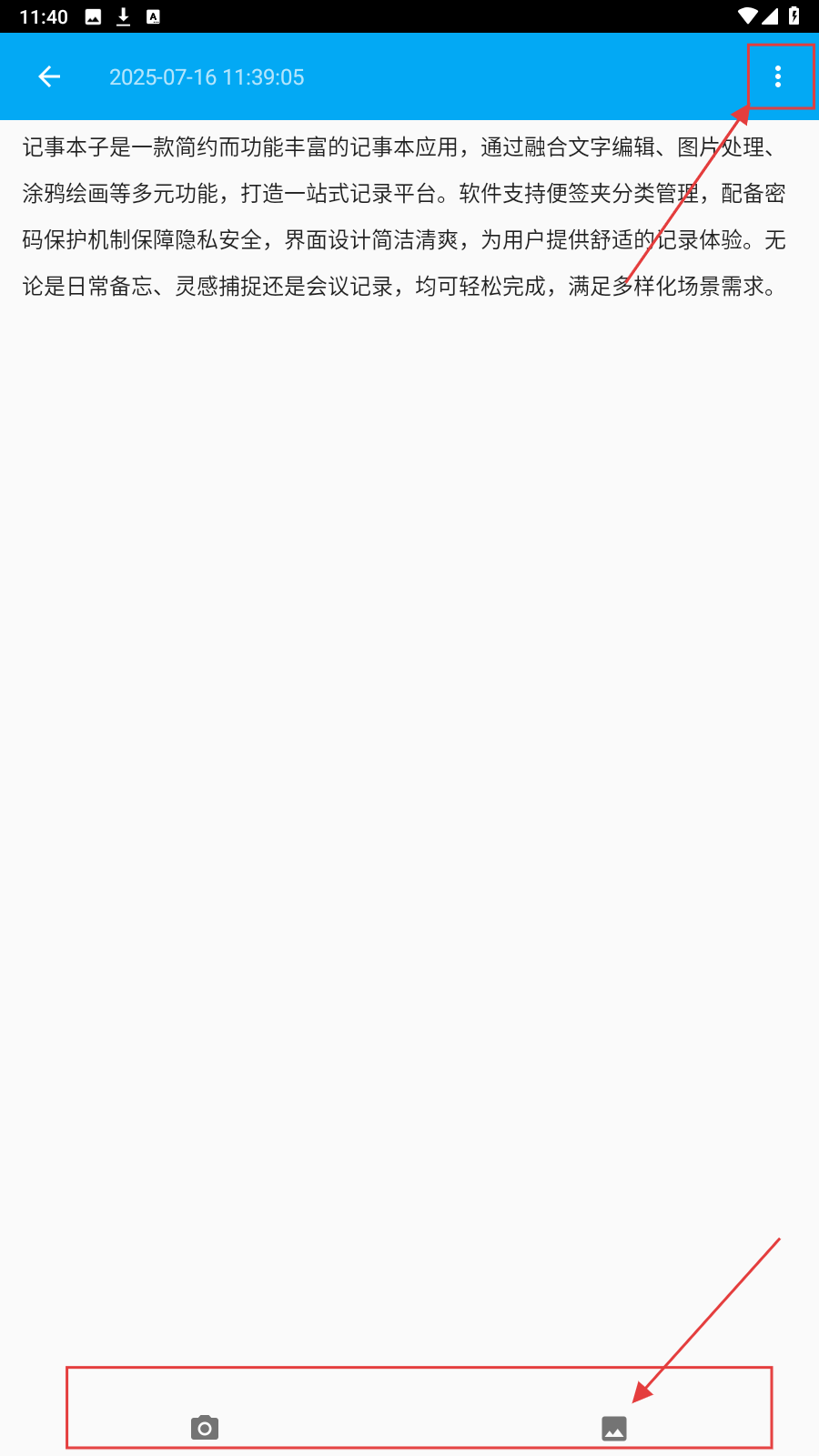 3、输入完成后,点击下方两个图标进行插图,插图完成后点击右上角的三点图标,打开更多选项菜单。