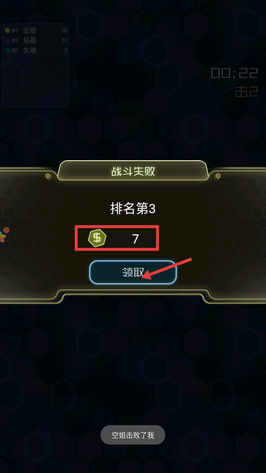4、战斗失败后,查看【排名第3】和奖励【$7】,点击【领取】获取奖励,总结经验开启新对局。