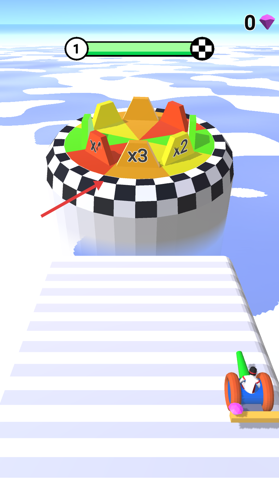 1、操控载具在赛道上前进,滑动屏幕控制小车的左右,点击屏幕,小车射出炮弹,击碎前方的障碍物。