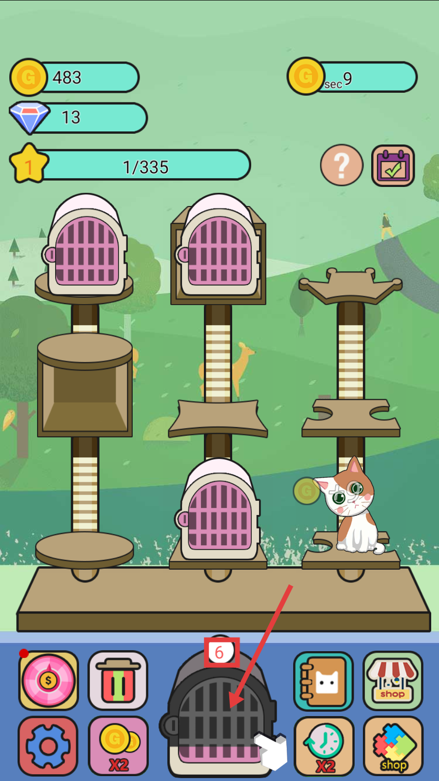 1、通过点击最下方粉色的笼子,当数字【6】变成【0】时,系统会赠送有小猫的笼子。
