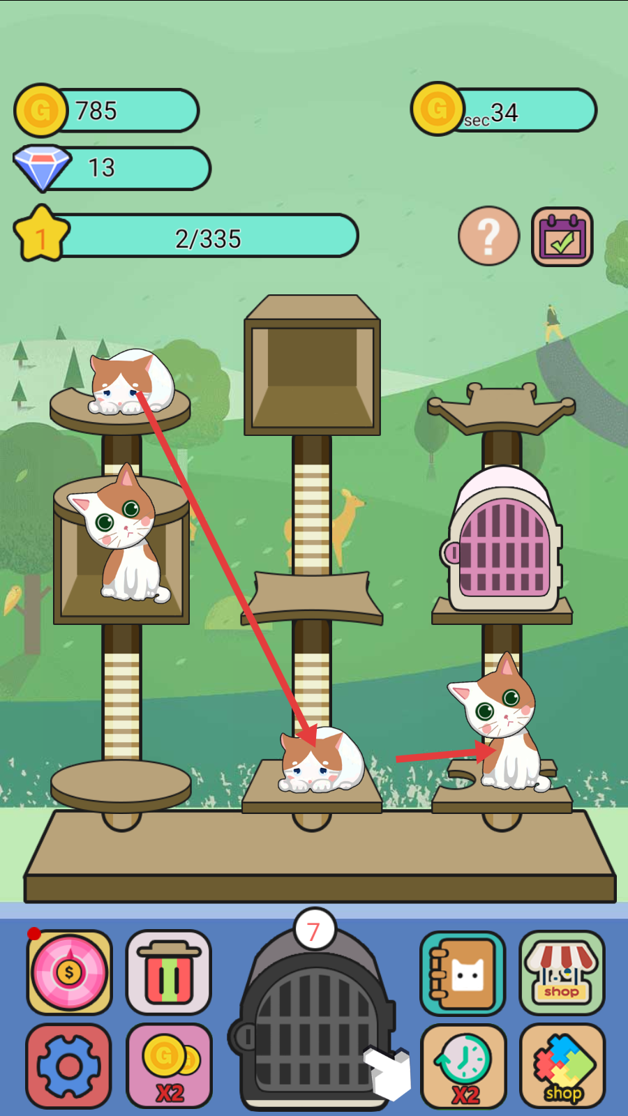 3、滑动屏幕,拖动两只相同的小猫进行合成。