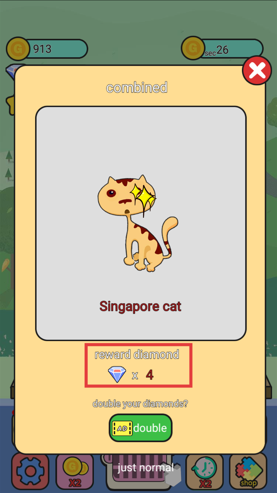 4、成功组合猫咪后,可获得钻石奖励,还可选择看广告使奖励翻倍。