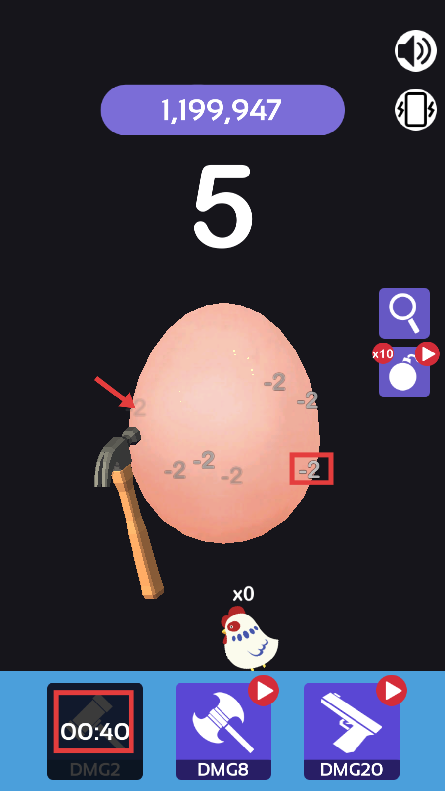 3、点击左下角【锤子】道具图标,每点击一下,鸡蛋的生命值从【-1】变成【-2】,只有8秒的限定时间。