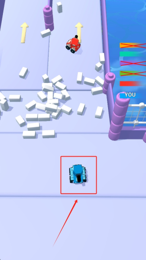 2、控制你的赛车(蓝色)沿着赛道前进,利用箭头指示的方向进行移动。
