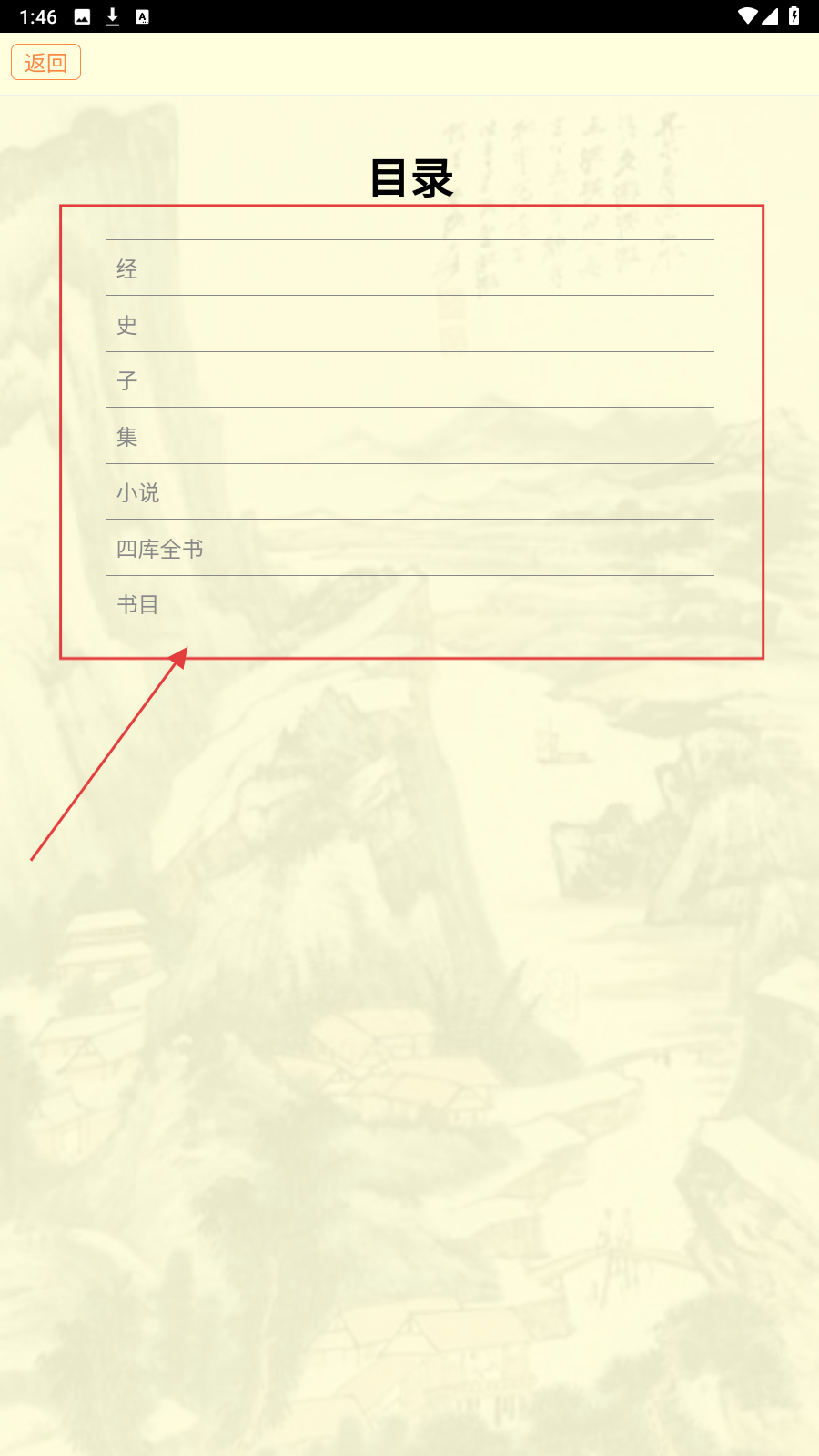 1、打开APP,在首页可浏览各类古籍分类,如经、史、子、集、小说、四库全书等。