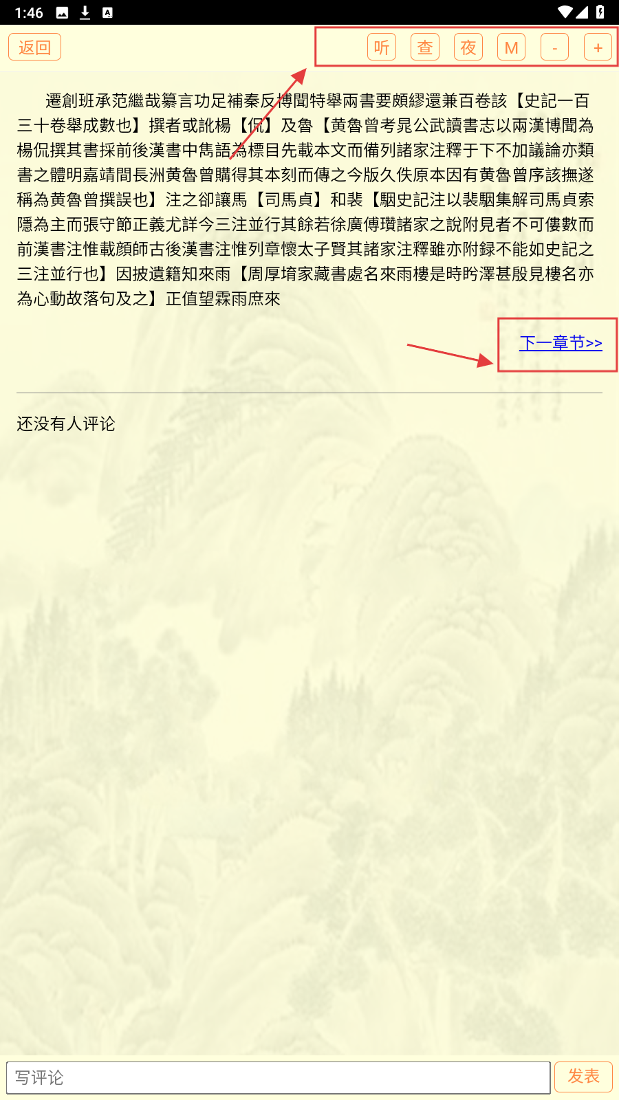 4、在阅读页面,可使用听书、查询等功能,还能进行字体大小调整,方便阅读。阅读完成后,可点击【下一章节】继续阅读后续内容。