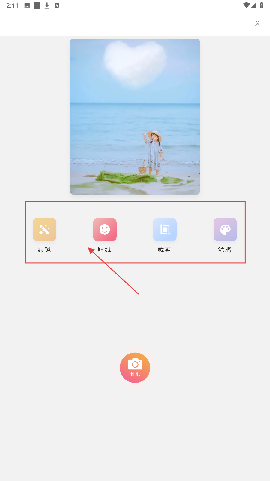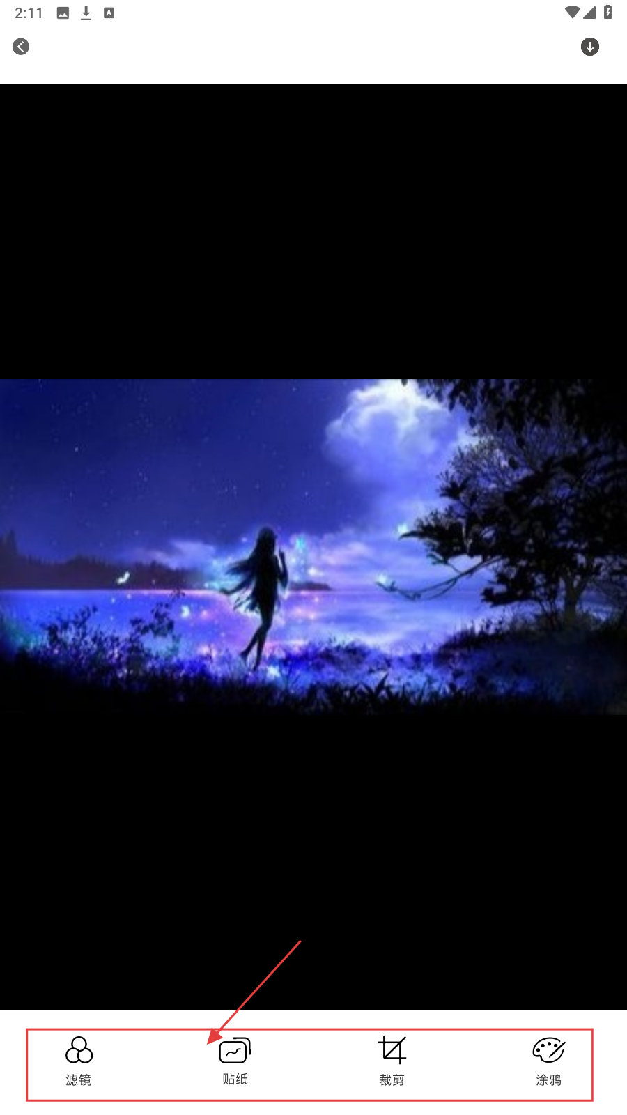 1、进入图片编辑界面,可看到【滤镜】【贴纸】【裁剪】【涂鸦】等功能按钮,按需选择使用。