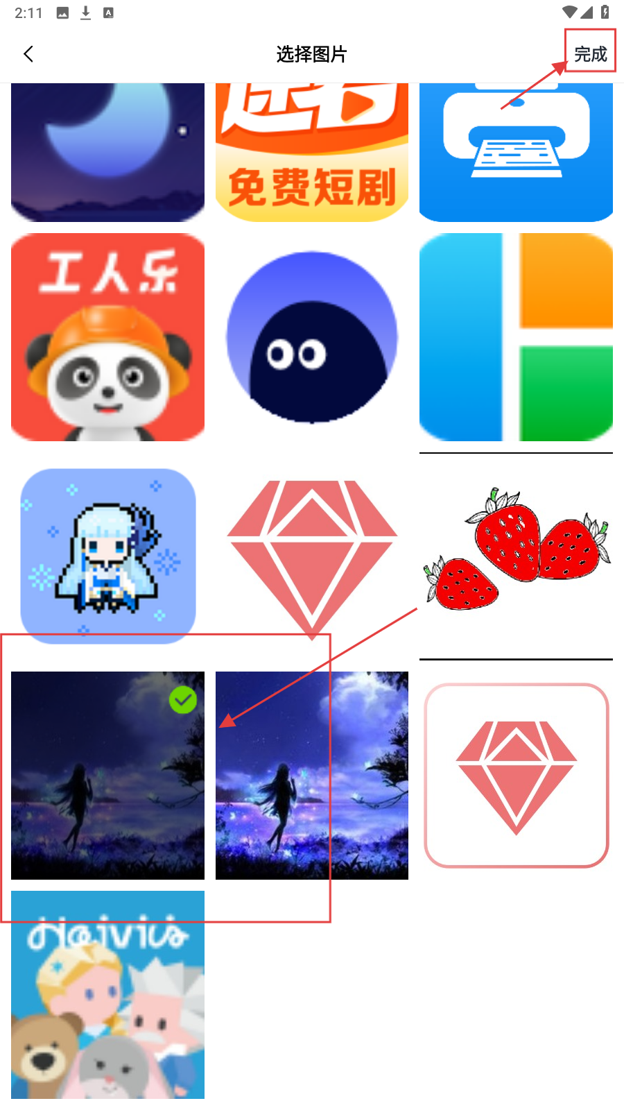 2、在选择图片页面,从众多图片中挑选合适的图片,选好后点击右上角【完成】按钮。